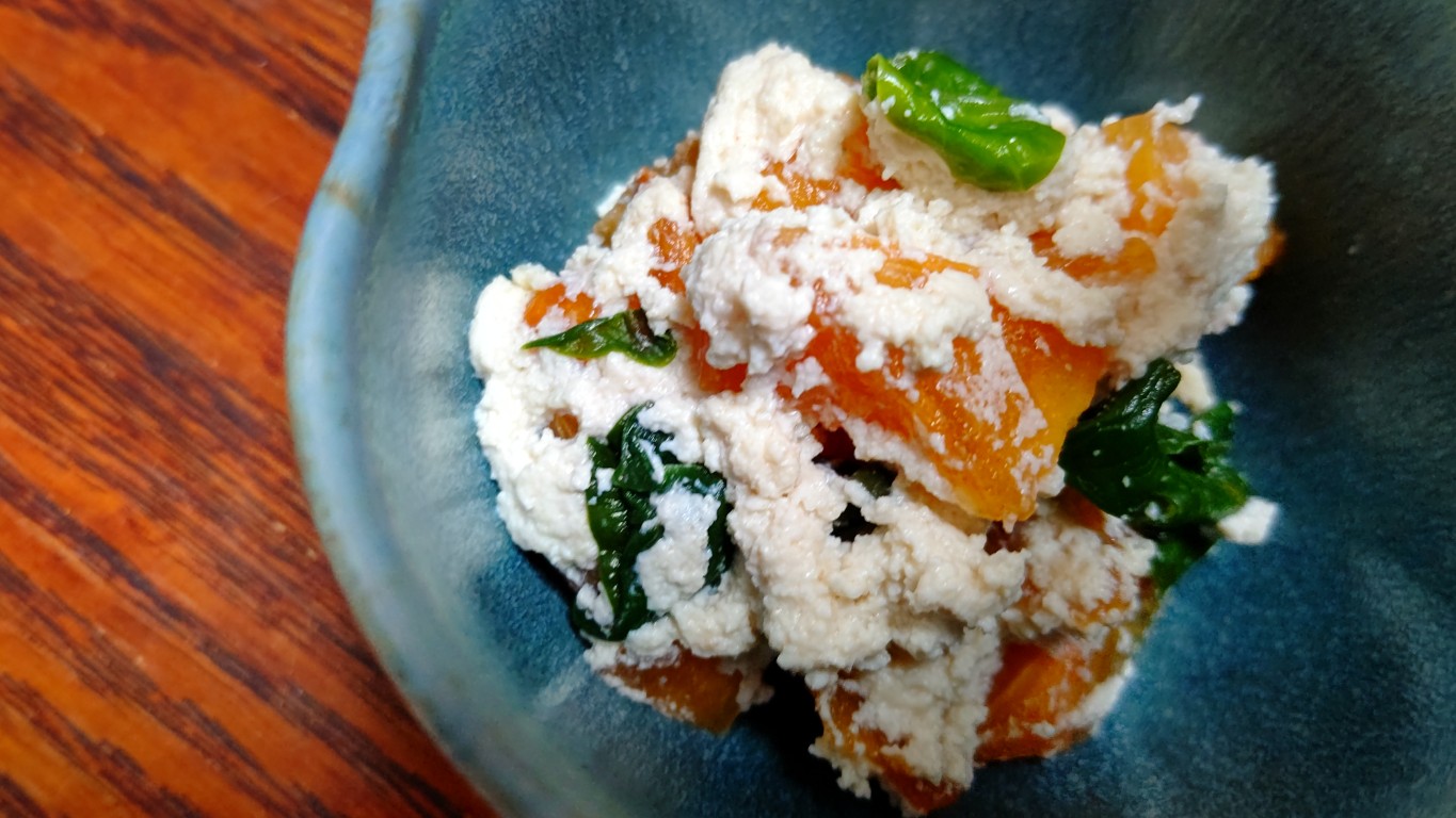 奈良と言えば柿ですよね。柿が半月ほど前から、すでに出回っています。青菜と共に白和えを作りました。湯がいて水切りをしたお豆腐を裏ごしし、塩・白味噌・白ゴマペーストを混ぜて、和え衣を作ります。お豆腐はすり鉢でするよりも裏ごししすると、とても滑らか、クリーミーになります。柿の甘味とお豆腐の和え衣が程よく混ざりあって、美味しい秋の一品となりました(^_-) by ichi